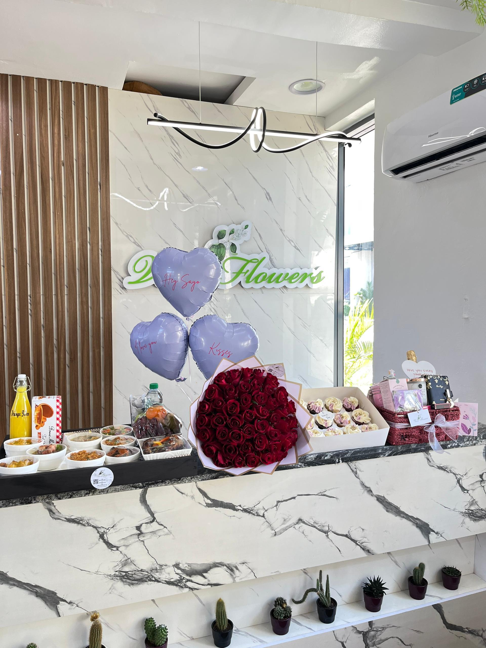 Luxurious Combo of 100 Red Roses, food Tray, 12 Cupcakes, Luxury Treat box, Heart shaped balloons, and a card